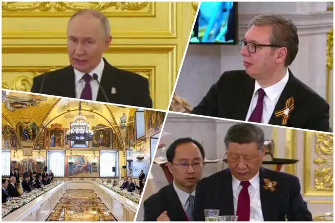 U luksuznoj dvorani Kremlja, pod raskošnim lusterima i okruženi zlatnim dekoracijama, ruski predsednik Vladimir Putin održao je svečanu zdravicu u čast svetskih lidera okupljenih na večeri u Moskvi. Među uglednim zvanicama za bogato postavljenim stolom nalazio se i predsednik Srbije Aleksandar Vučić, koji je prisustvom na ovom događaju potvrdio važnost odnosa između Srbije i Rusije.
