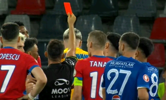 Pe scurt: portarul a fost eliminat pentru proteste verbale — în esență fraza „Ce ‘aia’ vezi? … îl vede Doamne‑Doamne” — pe care le consideră frecvente în limbajul jucătorilor, dar pe care arbitrul a interpretat ca injurie serioasă, justificând astfel cartonașul roșu direct.